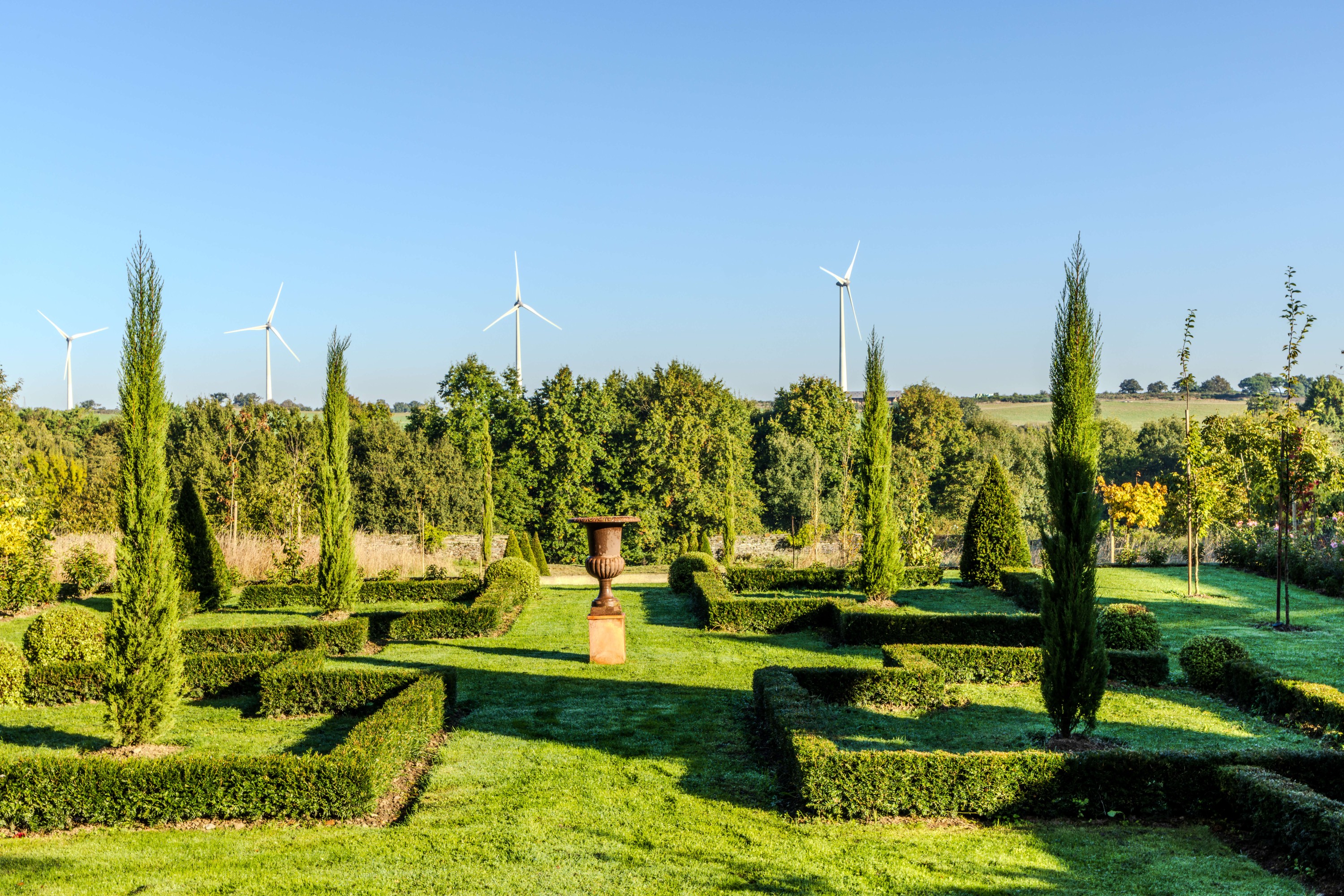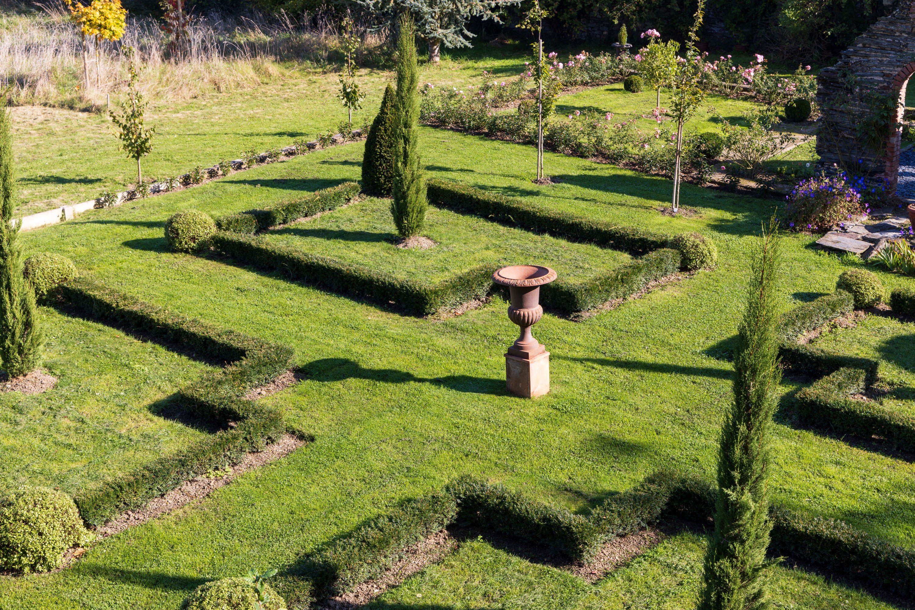 - Por último, una pequeña pradera desciende suavemente hacia un valle, proyectando el jardín principal en su entorno campestre.