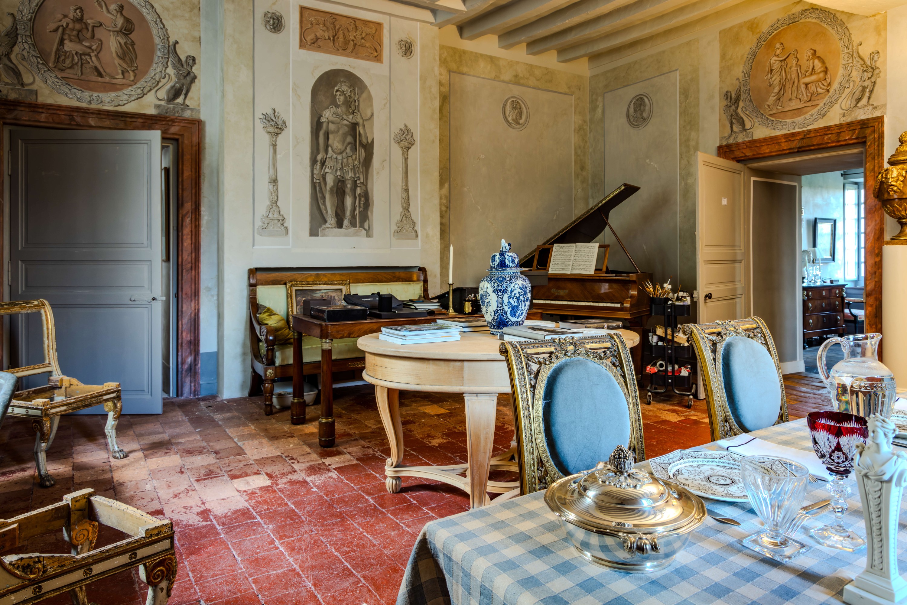 El salón cuenta con un techo pintado con vigas vistas, paredes decoradas y una chimenea neoclásica del siglo XVIII sobre un suelo de parquet de roble. Su elemento más singular es el pasaje que conduce a la escalera, diseñado como una galería. Este espacio está enmarcado por un pórtico de estuco de orden toscano y frisos pintados en grisalla que imitan bajorrelieves. El salón se conecta con la sala de música, da acceso a la escalera y se abre hacia el jardín en su lado este.