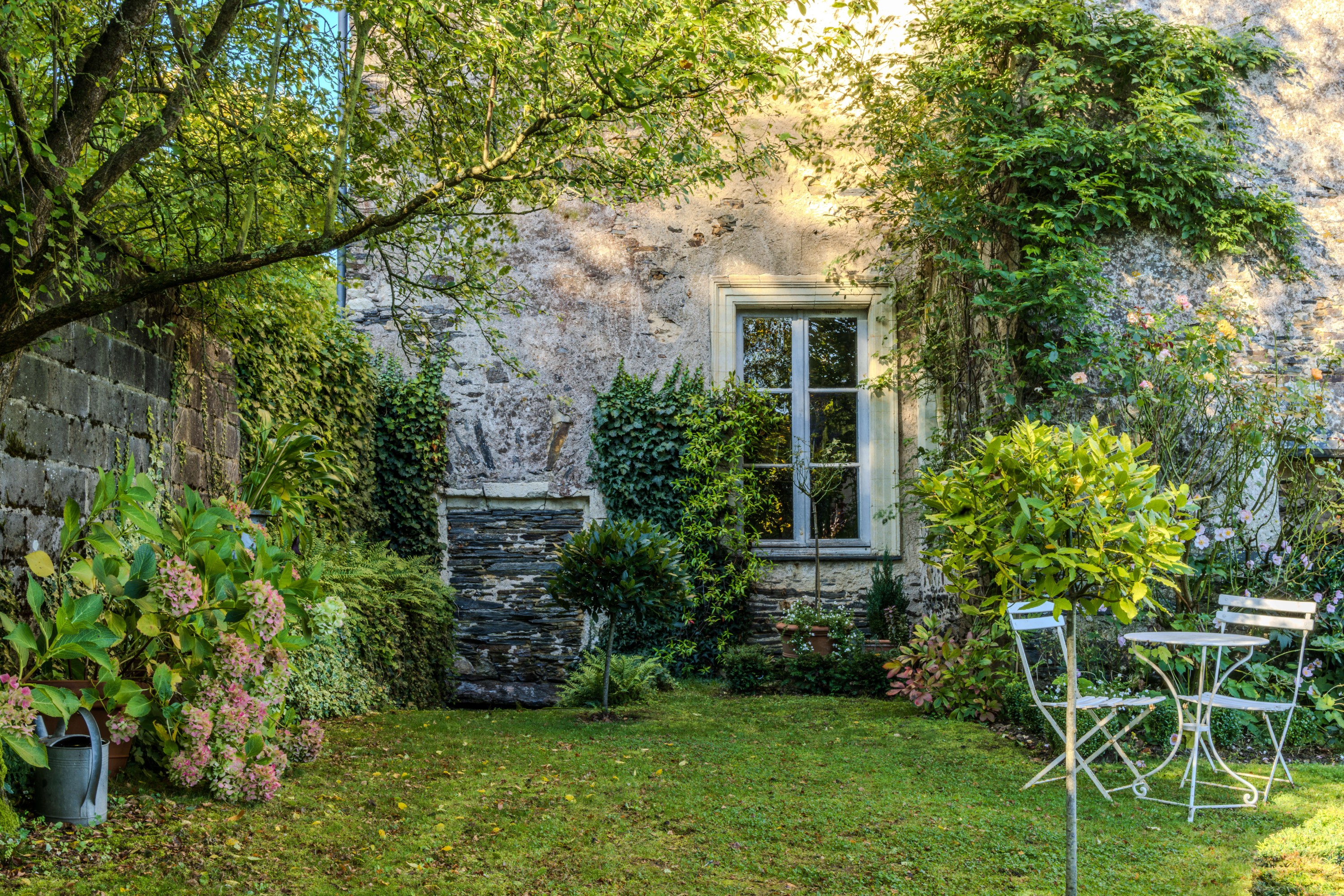 - Un segundo jardín, delimitado al norte por un muro de piedra seca con un ha-ha, se abre al paisaje circundante. Este espacio, plantado con árboles jóvenes, actúa como un vínculo entre el jardín formal y la pradera que se encuentra más abajo.