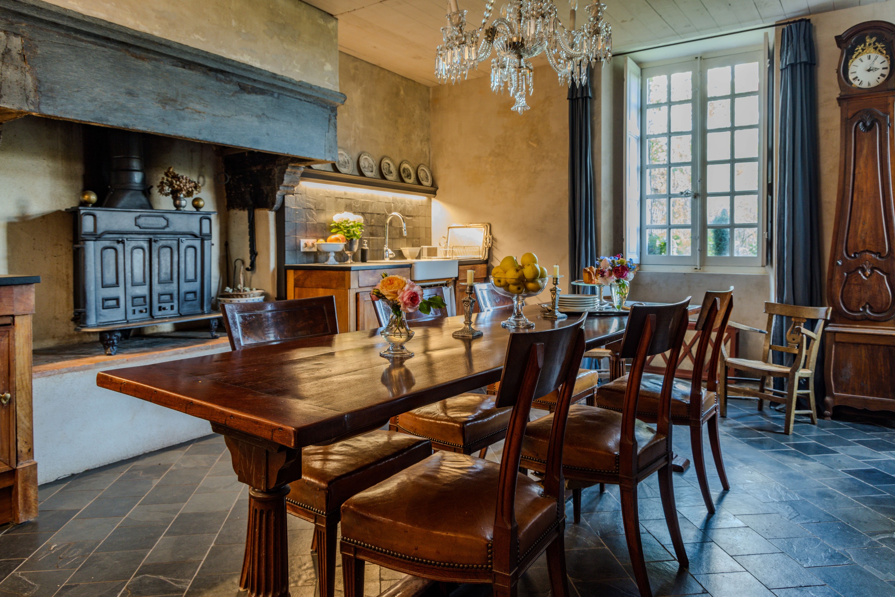 La cocina, amplia y acogedora, permite albergar una gran mesa ideal para comidas en familia o con amigos. El techo, revestido de madera pintada, junto con el suelo y las encimeras de pizarra, crean una atmósfera armoniosa. Una chimenea tradicional con campana recta subraya el propósito original de la estancia, que permanece inalterado. Las comodidades modernas se integran de manera discreta en este conjunto de carácter histórico.