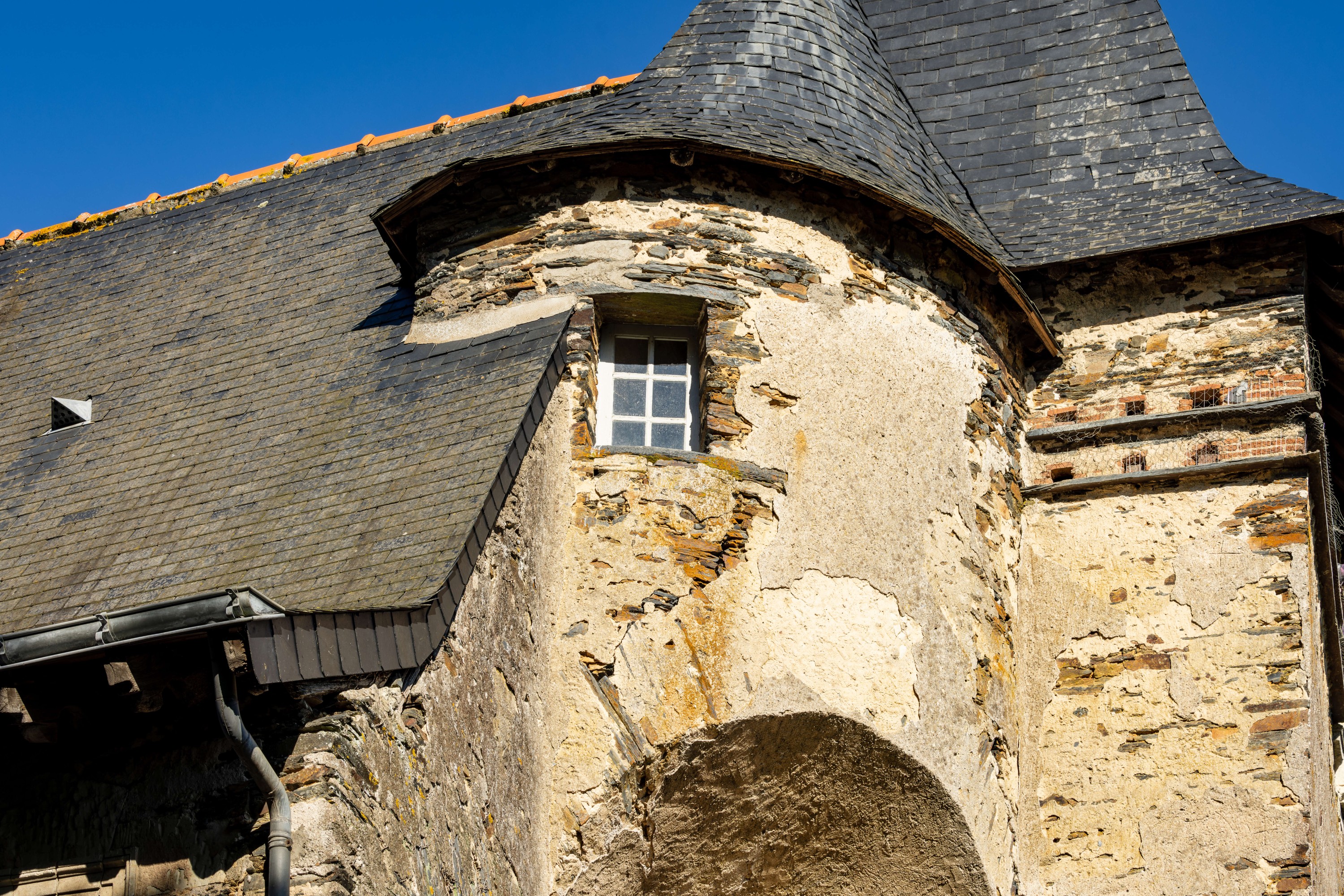 La torre de vigilancia evoca la época en la que los ducados protegían sus fronteras. Una torrecilla en ménsula que alberga una discreta escalera de caracol, junto con un arco de medio punto sobre pilastras decorado con un friso de estilo clásico, reflejan la llegada tardía de la arquitectura renacentista a las puertas de Bretaña. Los escalones de esquisto azul han demostrado su resistencia, soportando más de cuatro siglos de uso continuo.