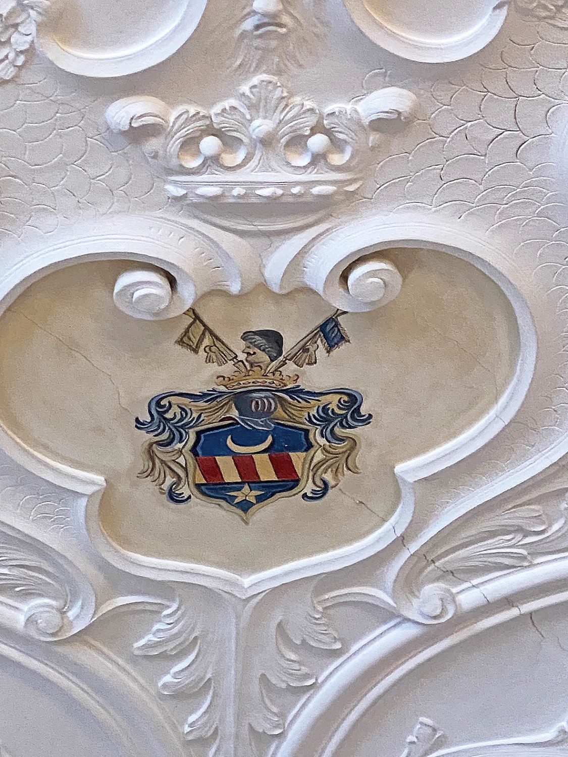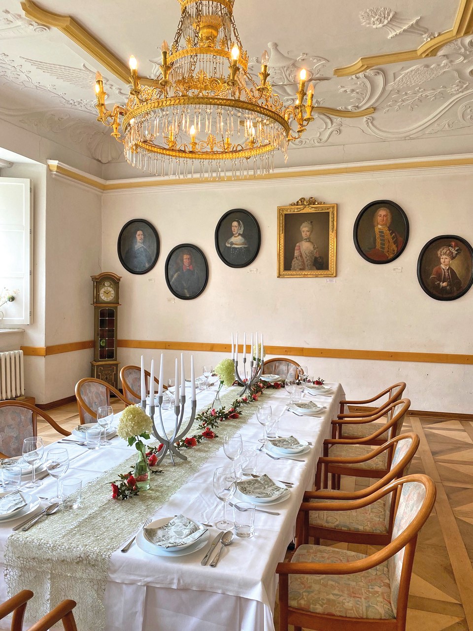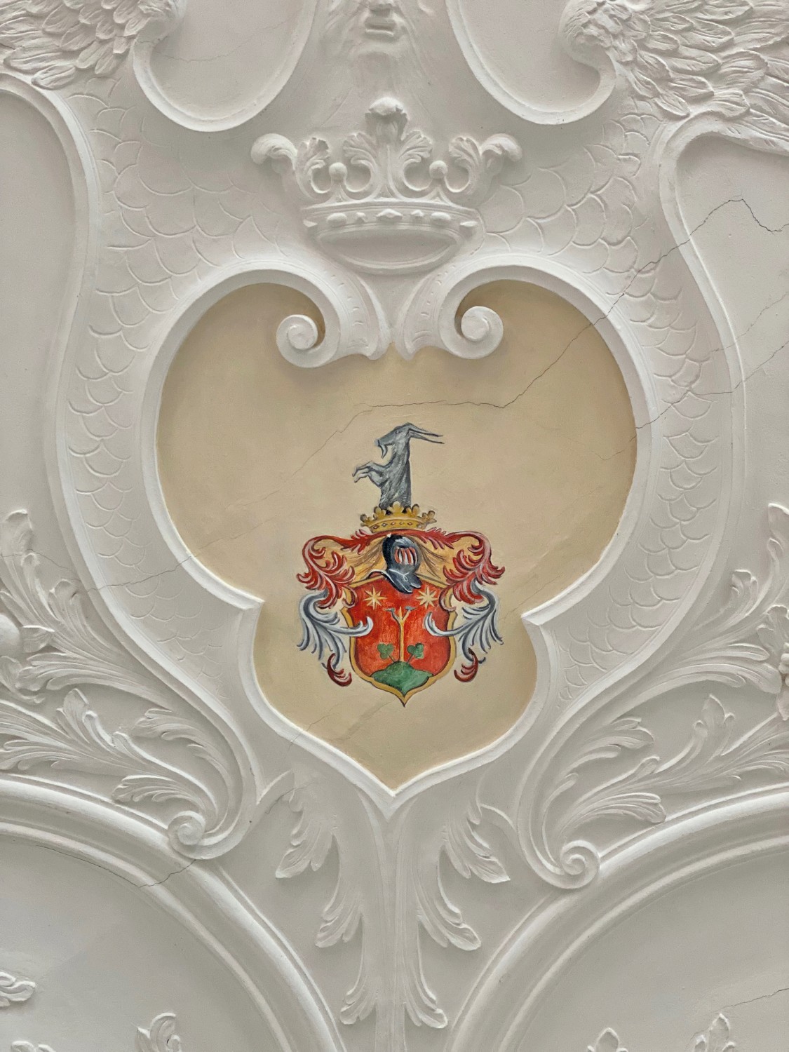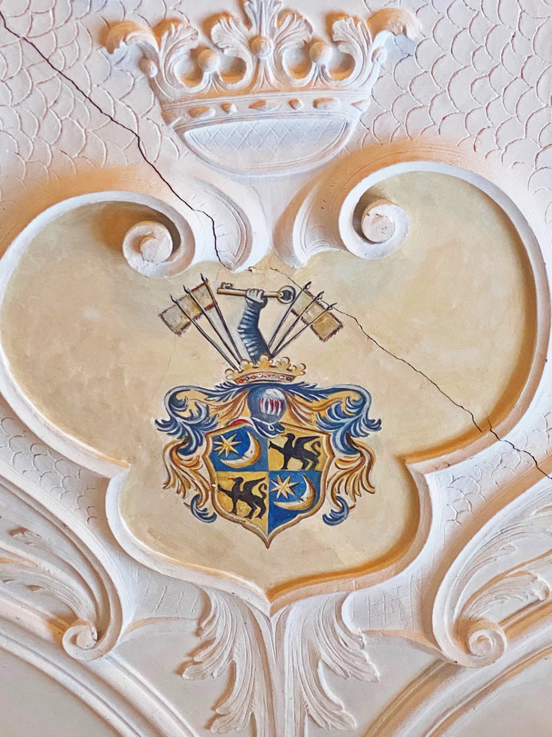 Los acogedores salones, la capilla azul con frescos de hace unos 300 años, el salón de celebraciones con techo estucado de estilo renacentista italiano, la galería de arte, el parquet y el vestíbulo con baldosas antiguas contribuyen a crear un hogar lleno de historia y carácter.
