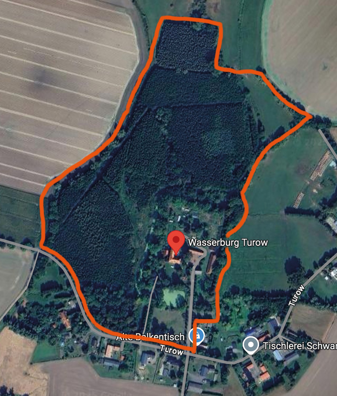 La propiedad se encuentra en el norte de Alemania, en el distrito de Vorpommern-Rügen (Mecklemburgo-Pomerania Occidental), en el municipio de Glewitz. Situada en las afueras del pequeño pueblo de Turow, en una ubicación rural y aislada, rodeada de campos, bosques y una valiosa zona paisajística protegida.