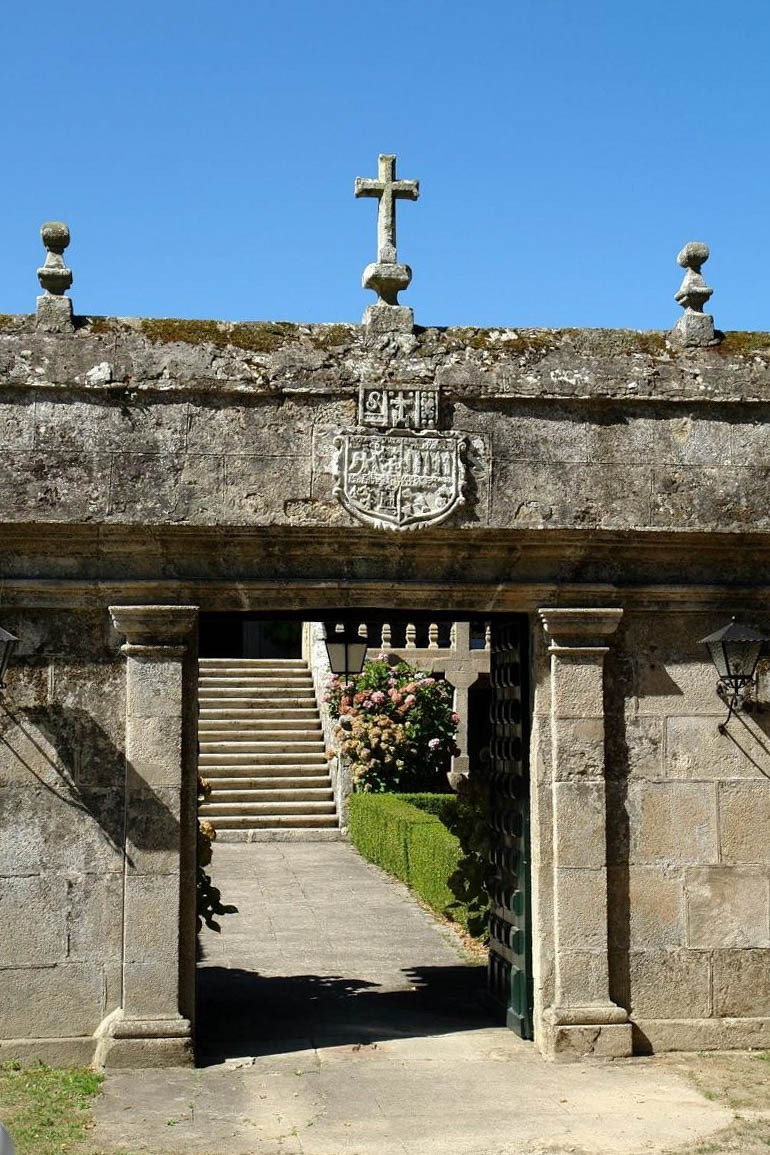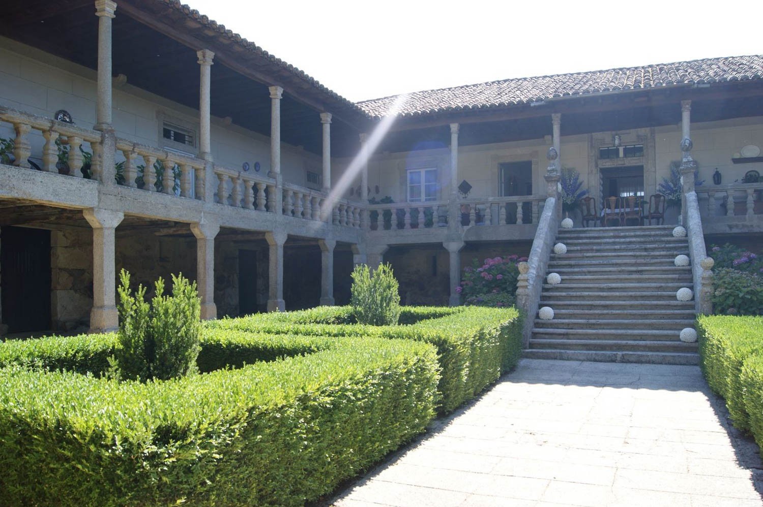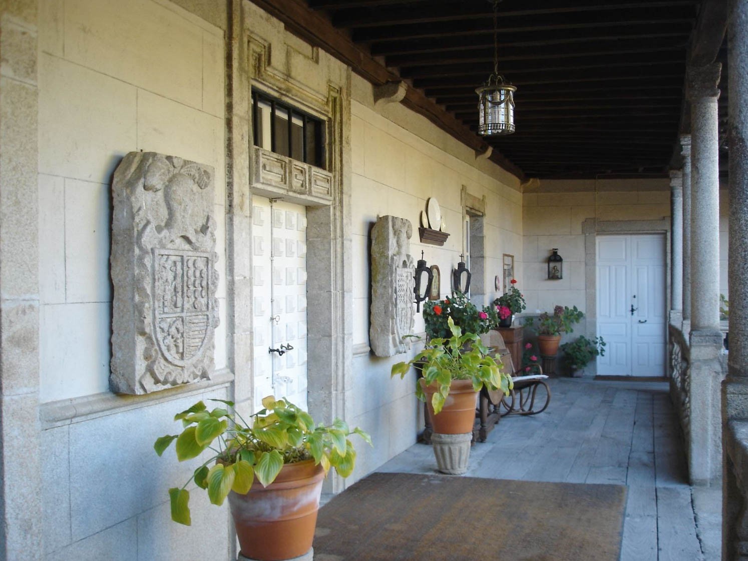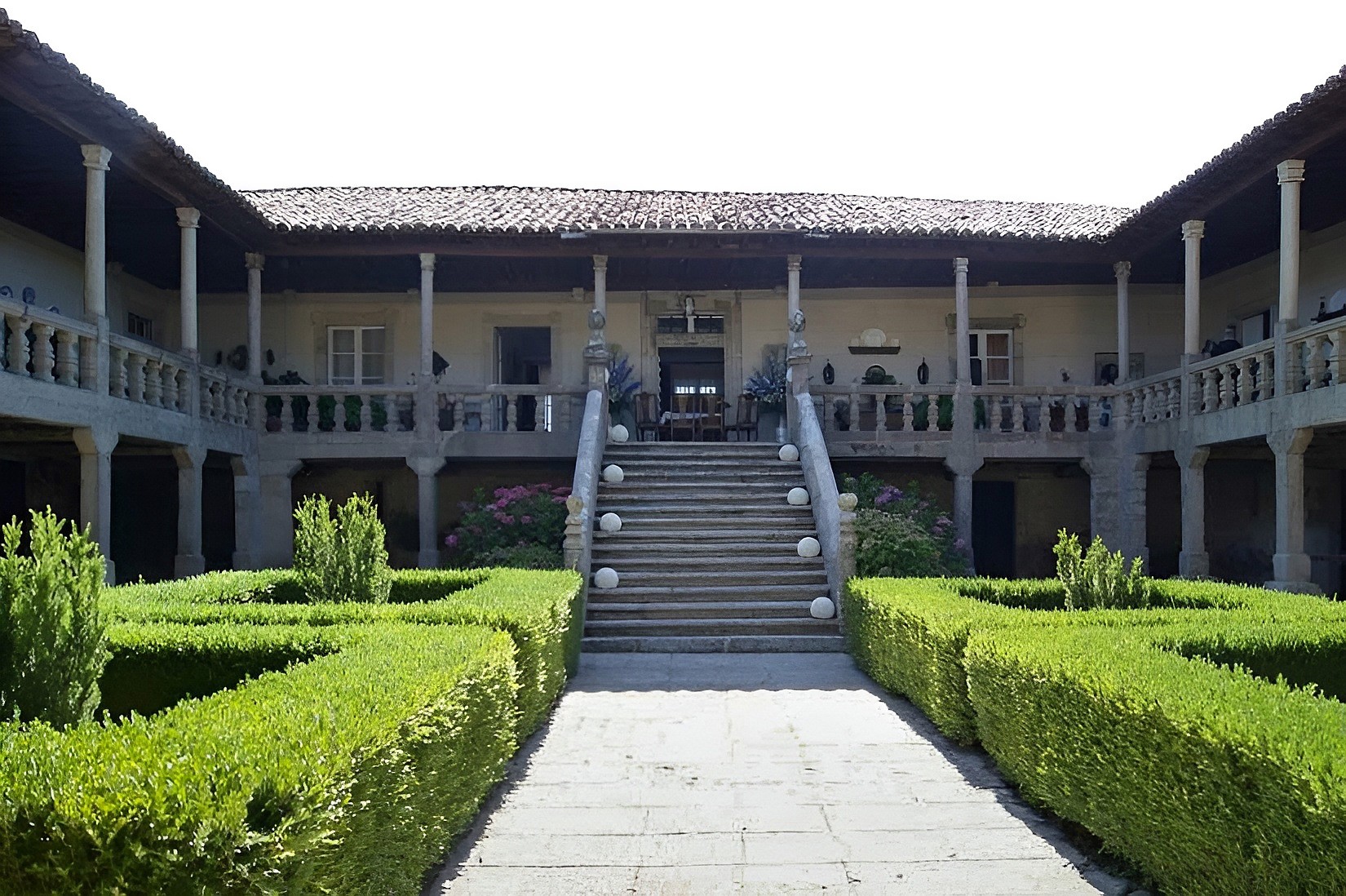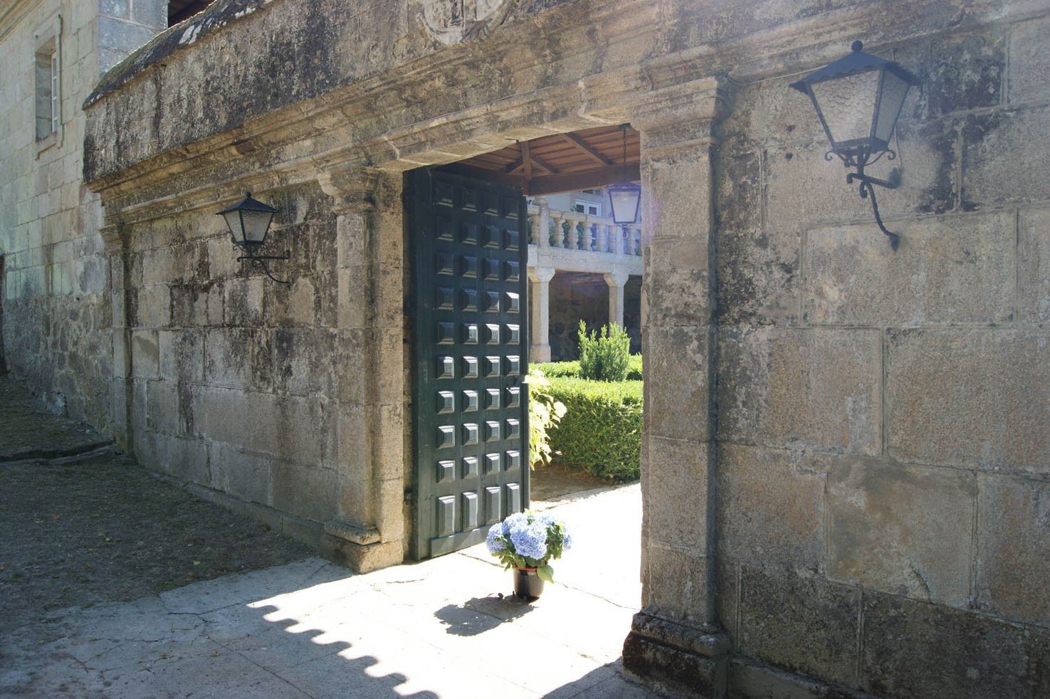 • La planta noble se accede a través de la magnífica escalera que conduce a los escudos de armas del "Pazo de Maside". El edificio de gran volumen consta de tres estructuras con una valla alta y una puerta con un escudo. El acceso se realiza a través de un pasillo exterior y un noble bosque de robles con árboles centenarios.
