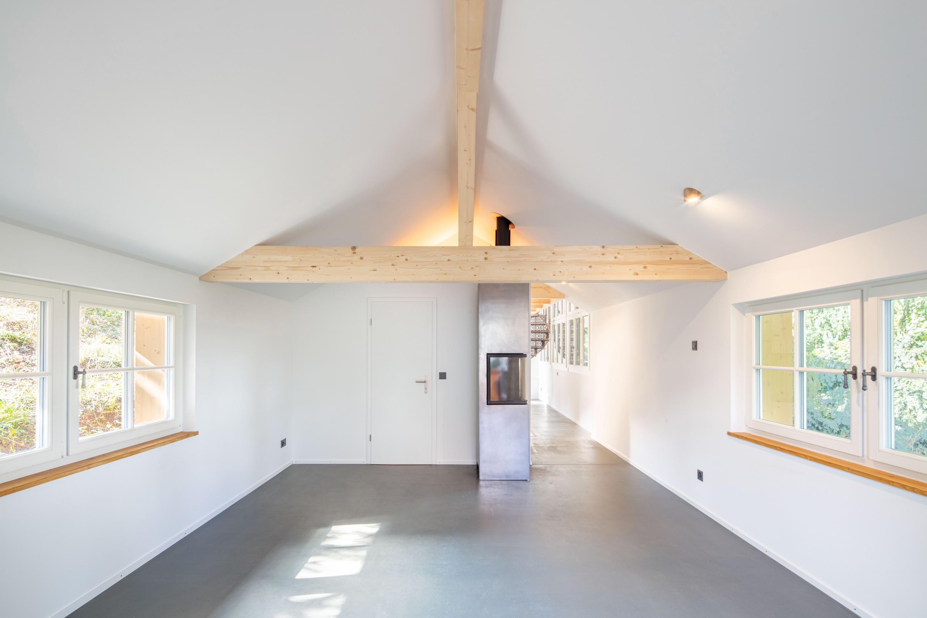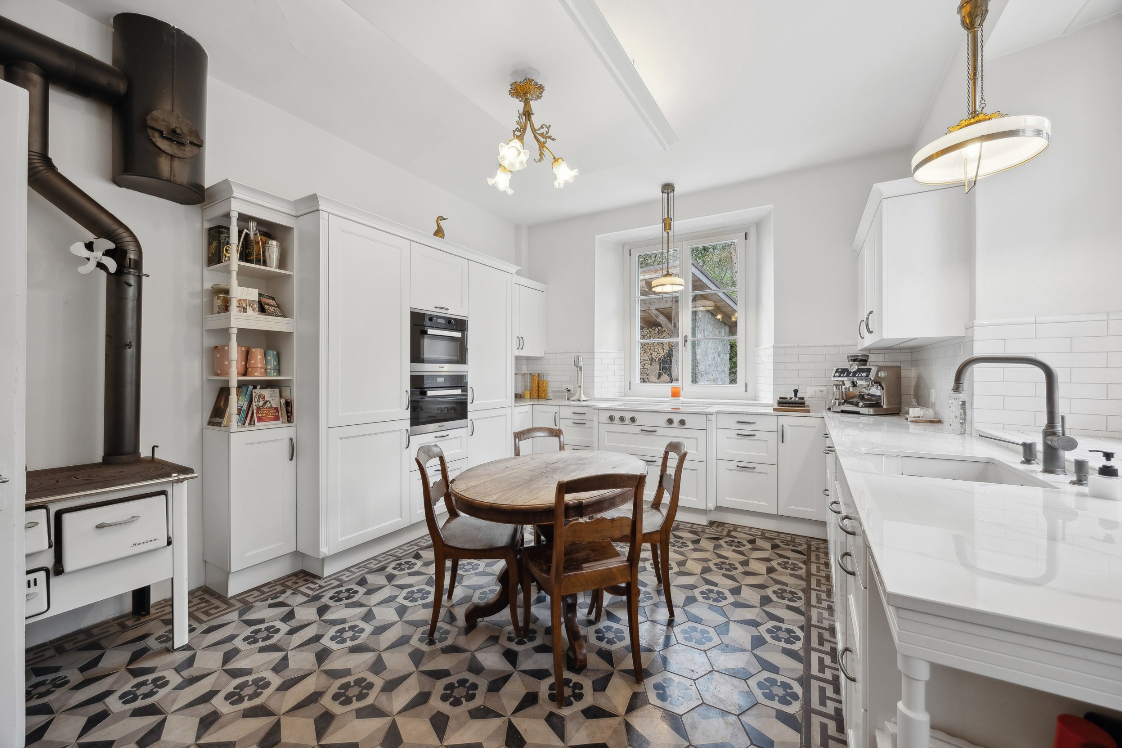 La casa principal ofrece aprox. 377 m² de superficie habitable neta, distribuidos en 7,5 habitaciones elegantes, incluyendo una amplia sala de estar con terraza panorámica, una galería en el ático y una cocina equipada con una histórica estufa de hierro fundido.