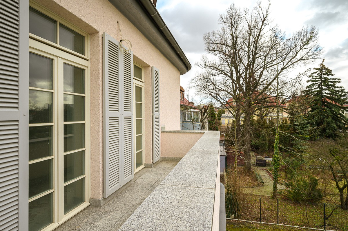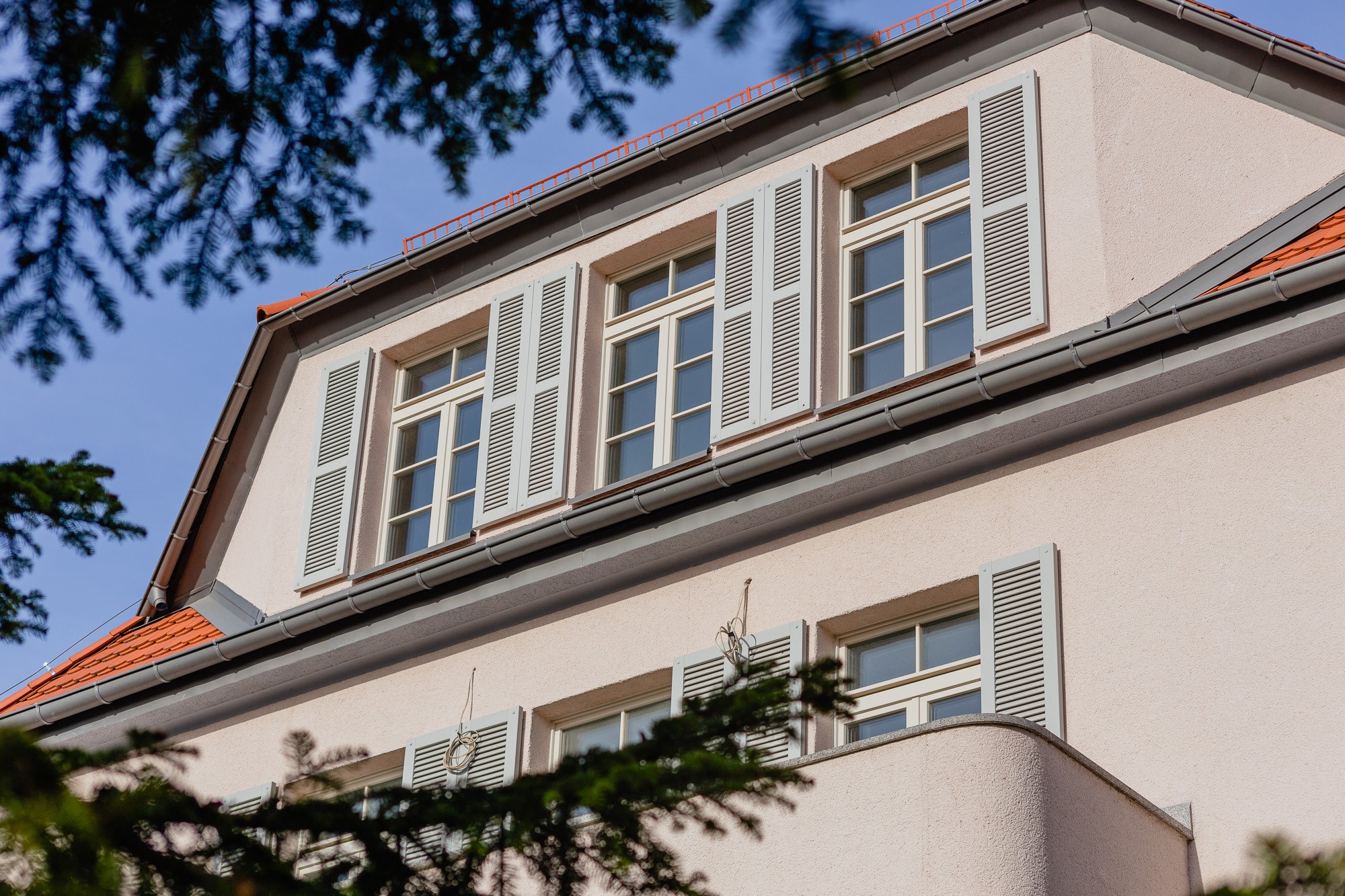 La parte trasera de la casa de época revela su verdadero potencial: grandes ventanales inundan los interiores con luz natural. Persianas decorativas azules y una amplia terraza elevada con un garaje para dos coches integrado completan la imagen elegante de la propiedad.