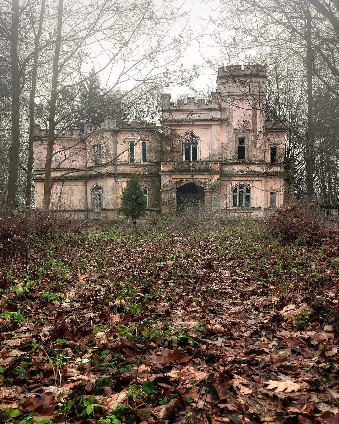 Pittoreskes Herrenhaus im Osten der Woivodschaft Masowien, ca. 100 km östlich von Warschau. Erbaut gegen Ende des 19. Jahrhunderts auf unregelmäßigem Grundriss, neogotischer und maurischer Stil. Privatbesitz.